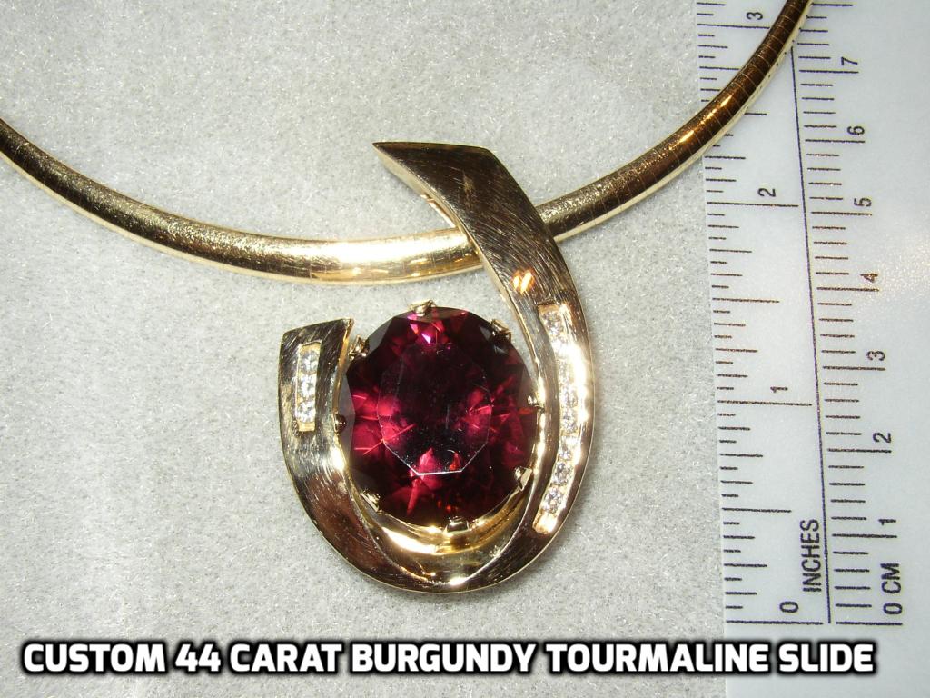 Below is an example of a piece that actually started as a rough piece of tourmaline. After faceting, the gemstone weighted 44 carats, which is large by any standards. A stone this large is difficult to design around due to its size. We showed this gemstone and interviewed several different custom jewelers, and each had his or her own ideas and recommendations, from enhancers to pendants to slides. We ultimately decided to choose the slide design. The final piece is simple yet stunning. The designer, with his experience, was able to use the stone’s size to his advantage, making a perfectly matched piece that is not overwhelmed by but also does not detract from the center stone, and creating a custom piece that can be worn at the grand ball or the Academy Awards.